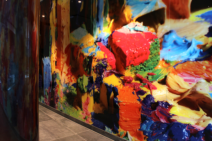 Motiviert vom Kontext der innerstädtischen Qualität des Ortes und der geografischen Eigenart Innsbrucks wurde eine bestehende Arbeit von Thomas Huber (downtown huabacity, reliefiertes Ölgemälde) mit spezieller Makrotechnik abfotografiert. Diese schrill chromatischen Images besetzen die bereits in der Planung des Gebäudes konzipierten Wandflächen und übersteigern die dezidierte Haltung der Architektur zur Materialität.