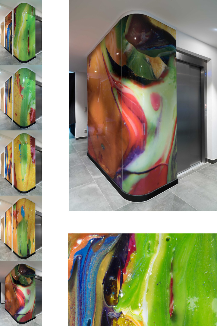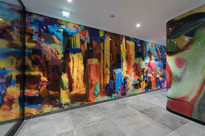 Out of the contextually urban quality of the location and the unique townsite of Innsbruck, an existing work of Thomas Huber (downtown huabacity, oil / relief) was photographed in advanced macro technology. The resulting, brightly chromatic images are staged on wall areas that were conceived in the planning of the building beforehand. They hyperbolize the decided attitude to materiality by the architecture.