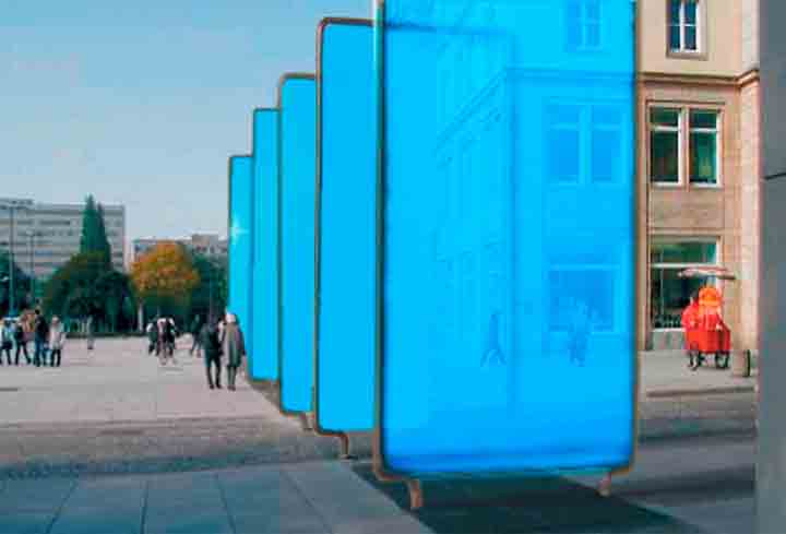 Das Vorbild einer nüchternen Sicherheitsschleuse (wie in Flughäfen oder Kaufhäusern) aus parallel zueinander stehenden, vertikalen Flächen mit Rahmen, bekommt aus seinem Kontext genommen eine erste, im Maßstab geändert eine zweite, durch seine Ästhetisierung eine dritte, andere Aussage.