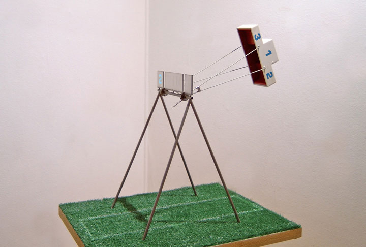 For regular use of the interactive sculpture in context of an exhibition, afterwards amplitude reductions are activated at the bearings to limit the swinging motion to a small measure for the safety of the user and the spectator (amplitude ~ 60° each side to reach the “3”). For the regular visitor, the loop has to be accomplished in the imagination.